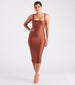 Ultra-desirable for sun-soaked days and balmy nights! This sleeveless tank dress features a square neckline, wide shoulder straps, a bodycon silhouette, and a midi-length hem on shiny smooth double-lined knit fabric. Complete the look in minimalistic hoop earrings and heels.