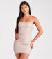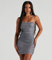 Give off glimmering disco ball vibes in this stunning glitter knit mini dress! The short dress features a sleeveless square neckline, thin rhinestone embellished straps, a cross-back strap design, ruching down the side seams, and a short, curve-hugging silhouette. The glitter knit fabric showcases a gorgeous iridescent sheen. Style with clear heels.