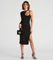 It doesn't get better than having this knit midi dress in your rotation! The dress features a trendy one-shoulder crew neckline with a long sleeve, spaghetti strap, and cutout bust that leads to the form-hugging silhouette with a sultry side slit hem. Complete the look in chic marabou heels.