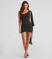 Bring the drama with a high fashion flair! Make an entrance in this crepe one-shoulder mini dress featuring a sleeveless bodice, one tank-style strap with a chiffon-draped accent, a high waist seam, and a faux wrap bodycon skirt. Complete the look in rhinestone strappy heels.