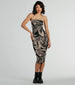 Serve chic looks on your dreamy escape in this tropical print midi dress. The stretchy lined knit fabric showcases a detailed tropical print pattern on the figure-flaunting silhouette. The bodice features a strapless elasticized straight-across neckline, leading to a bodycon fit with a mid-length hem. Style with combat booties to add some edge!