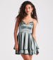 Create a dreamy allure in this satin skater dress for your upcoming social occasions! It features a sleeveless v-neckline, adjustable spaghetti straps, a lace-up back design with zipper closures, and a tiered ruffled short-length hem. Complete the look with a beaded clutch and heels.