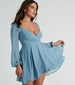 This dreamy long sleeve chiffon skater dress has a flowy silhouette to give you that effortlessly ethereal look! The short dress is crafted with an airy sheer chiffon fabric for a lightweight feel, and includes a partial knit lining for coverage. The bodice is shaped with a V-neckline with a chic pleated surplice design, and the sheer long balloon sleeves have cinched hems. The back features a partially smocked design for added stretch. The high waist seam flows out to a short skater skirt with a fit and flare silhouette and a faux wrap-front design. Complete your outfit with block heels for a bridal shower or birthday party!