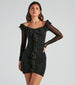Chic and stunning, this curve-hugging mesh mini dress is perfect for getting drinks with the girls! It features an off-the-shoulder neckline, long sheer fitted sleeves, a ruffle overlay with a ruffled accent down the center, front ruching, and a short, bodycon silhouette. Style with your fave pair of strappy stilettos.