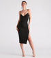 Effortless and romantic, this sleeveless midi dress is a staple to have for every occasion! It features a V-neckline with a twisted bust, spaghetti straps, a form-hugging silhouette, and a sultry front slit. The mid-length dress is stretchy and double-lined. Complete the look in rhinestone mules.