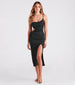 Showcase that effortless summer style this season with this ribbed knit midi dress. It features a sleeveless one-shoulder neckline with a single spaghetti strap, a ruched side cutout with an adjustable drawstring, and a midi-length, curve-hugging silhouette with a chic front slit. Complete the look with strappy sandals.