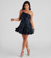 Bring your flirtatious style to Homecoming in the stunning Eve sequin party dress! She features a sleeveless one-shoulder neckline with dual spaghetti straps, a high waist seam, and a short party skirt with a fab fit and flare silhouette. The lined mesh fabric showcases all-over sequin embroidery in a chic scroll pattern. Style this dress with rhinestone duster earrings and a glitzy clutch.