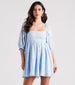 You'll be a darling delight in this short skater dress perfect for parties and ceremonies! It features three-quarter-length puff sleeves, a square neck, a smocked back, and a fit and flare silhouette. The dress is composed of a floral burnout woven fabric with a chiffon lining and no stretch. Style with earrings and a choker to complete the look!