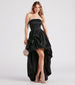 Flirty with a touch of daring perfectly describes the Faith formal high-low dress! A chic option for school dances, galas, and dressy cocktail receptions. She features a strapless neckline, a lightly padded bust, a fitted bodice and pleating, and a trendy bubble hem on a high-low silhouette that brings chic-dramatic flare to any party. The formal dress is composed of a woven taffeta-lined fabric with no stretch. Style with a glitzy sphere clutch and strappy heels for a touch of sparkle!