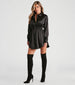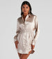 The perfect satin short dress for a night of wine and dining! Featuring long sleeves with buttoned cuffs, a collar neckline, button-up front closures, a smocked waist, and a curved short-length hem. Complete the look in knee-high boots.