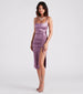 Watch everyone fall for you in this luxe satin midi dress at rehearsal dinners, graduations, and dressy cocktail parties! The dress features a sleeveless square neck, spaghetti straps, a bodycon silhouette, and an adjustable front ruching atop a flirty slit accent. The sleek satin-knit fabric offers a moderate stretch. Complete the look with a stunning collar necklace.
