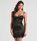 Look and feel oh-so-glam in this sleek satin mini dress! It features a sleeveless sweetheart neckline, a structured bust with a sparkly rhinestone embellished trim, adjustable spaghetti straps for a customized fit, and a short, curve-hugging silhouette. Style with strappy stilettos.