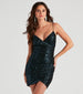 Shake things up in the Felicity sequin party dress to make your sparkling entrance at a birthday celebration or girl's night! She features a sleeveless v-neckline, sleek bungee spaghetti straps, and a wrap bodice with side pleating to give the illusion of an hourglass figure along her bodycon mini-length silhouette. The formal party dress is composed of a sequin fabric with a knit lining and minimal stretch. Complete your striking look in silver heels.