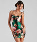 Bring your flirty style to your date night look in this gorgeous satin floral mini dress! It features a sleeveless cowl neckline, spaghetti straps, an open back with a lace-up strappy design, and a short, curve-hugging, bodycon silhouette. Complete the look with sleek hoop earrings.