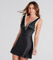 Give off a flirty attitude in this adorable dress perfect for date night or girl's night out. It features a sleeveless plunging V-neckline with a tie-front detail, tank shoulder straps with a dainty sheer lace trim, an alluring open-back design, a mini-length hem, and a flowy A-line silhouette. The satin woven fabric includes a woven lining. Style this short dress with sleek stiletto heels.