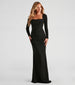 Curve-loving with sultry details, the Florence formal dress brings sophistication to your next celebration, ceremony, or dressy gala dinner! She stuns in a long sleeve, square neck bodice with side ruched seams and a sexy, partial open back with lace-up closure. Florence hugs your body like an hourglass in her mermaid silhouette featuring pleating and a floor-length hem to elongate your figure. The formal dress is composed of slinky knit fabric with lining and a moderate stretch. Complete your dressy look with a statement necklace and earrings set.Â