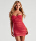 Forever flattering and figure-flaunting! This mesh bustier style dress hugs your curves like an hourglass. It features a sleeveless sweetheart neck, adjustable spaghetti straps, built-in padded bust and pipe trim, side ruched seams, and a mini-length hem. Complete your sultry look in platform heels.