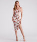 You'll look pretty as a picture in this floral satin midi dress for all of your springtime frolics! It features a sleeveless v-neck, adjustable spaghetti straps a cowl pleated neck overlay, and a form-hugging silhouette with a sultry side slit. Style with a chic handbag for a date or wedding shower!