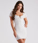 Catch yourself a cutie-looking flirty in this eyelet mini dress featuring short puff sleeves, a sweetheart neck, a ruched bust with a tie front, a corset-seam bodice, and a bodycon silhouette. The dress is composed of stretchy eyelet lace fabric with a knit lining. Complete the look with a dainty choker and earrings set.