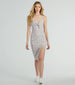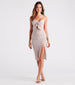 Frolic all over town in this floral midi dress perfect for an afternoon tea with the girls! It features a sleeveless V-neck, spaghetti straps, a knot tie bust, a curve-hugging silhouette, and a flirty front slit. The dress is designed with a ditsy floral bud print on stretchy knit fabric. Complete the look in trendy wedge sandals.