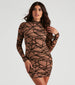 Elevate your closet in this mesh mini dress to make a bold statement at the party! The dress features long sleeves, a mock neck with dual button closures, a bodycon silhouette, and velvet geometric line patterns. Complete the look in PVC strap heels.