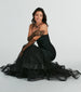 Capture the essence of chic sophistication in the Giana tiered ruffled tulle corset mermaid gown, a gorgeous style set to stun at a black-tie soiree! The formal dress is crafted with a bandage knit fabric at the bodice that continues through the waist and legs with plenty of stretch, giving that iconic snatched silhouette. Her sleeveless bodice is shaped with a sweetheart neckline with a built-in padded bust and thin adjustable shoulder straps. Her corset-style bodice features flexible boning inserts for added structure and a high waist seam. The bodycon fit continues down the leg with a streamlined look, flaring out in a floor-sweeping mermaid silhouette with an exquisite design. Her tiered ruffled tulle will bring that dramatic flair, featuring bonded hems for structure and multi-layers of tulle lining for a voluminous effect. Complete your gorgeous look with sheer gloves and a rhinestone jewelry set.