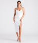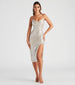 If you're looking to sparkle this glitzy sequin midi dress is the perfect shimmery option! The short dress features a sleeveless V-neckline, bungee spaghetti straps, a form-hugging silhouette, and a front-slit accent. Complete the look with a glam hair accessory for a flawless updo!