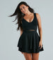 Let your date give you a twirl in this sweet crepe skater dress at weddings and dressy celebrations! It features a sleeveless plunge V-neckline, tank shoulder straps, a V-cut back, a padded bust, a flirty sheer mesh waist insert with a crisscross design and a short-length layered hem. The crepe fabric offers a moderate stretch. Complete the look in this skater dress with a sparkly rhinestone bracelet and block heels.