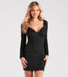A glitter mini dress to inspire your glam girl era! The short dress features a V-neckline with a surplice design, long fitted sleeves, a mini-length hem, and a bodycon silhouette that will hug your curves, this dress is a dream! The glitter knit fabric offers a moderate stretch. Style this mini glitter dress with clear heels.