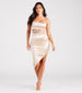For all of the glam kind of girlies! This satin midi dress brings luxe vibes to your night. Featuring a sleeveless square neckline, spaghetti straps, a cutout waist with a rhinestone-embellished bar strap, a flattering bodycon silhouette, and an asymmetrical side slit hem. Complete the look in door knocker earrings for a cocktail party or dressy date night!