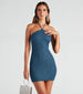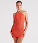 Bring the sparkle on your next girl's night out in this glitzy glitter mini dress. It features a sleeveless halter neckline with spaghetti straps, a partially open back, and a short, form-fitting silhouette that will hug your curves. Style with rhinestone fringe earrings and an embellished evening bag.
