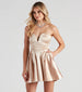 You'll look like a glowing gemstone in this gorgeous satin skater dress! It features a strapless wired V-neckline, pleated detailing at the bodice, a high waist seam, hidden side pockets, and a short skater skirt with a fit and flare silhouette. Style this adorable dress with embellished heels for all the more glow.
