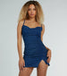 Create an enchanting aura in this gorgeously glitzy glitter knit mini dress! Designed with a sparkly textured glitter knit fabric, this short dress features a sleeveless cowl neckline and spaghetti straps that lead to an alluring open back with a lace-up strappy design for a customized fit. The ruched side seam will accentuate your stunning curves on the bodycon silhouette, leading to a short slit accent at the mini-length hem. Style with rhinestone heels for all the more glamour your next night out.