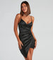 Amp up your night-out vibe with this gorgeous sleek satin mini dress! It features a sleeveless V-neckline with a wrap-front design, spaghetti straps, pleated detailing at the waist, and a mini-length, asymmetrical, faux wrap silhouette with a curve-hugging fit. Style with clear heels.