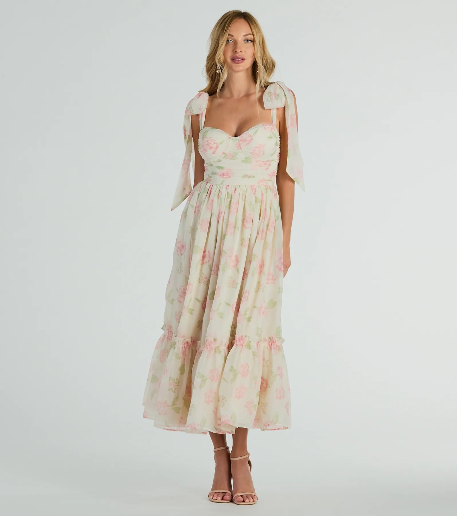 From garden parties to bridal showers, the Gretchen floral chiffon midi dress will be the perfect pick for any formal occasion! The delicate tie straps and sweetheart neckline with non-slip grip lining add a touch of elegance. The padded bra cups and ruched bodice provide a flawless A-line silhouette, making it perfect for any occasion. The ruffled midi-length hem flows beautifully into the floral-printed chiffon fabric. Complete the look in stiletto heels.