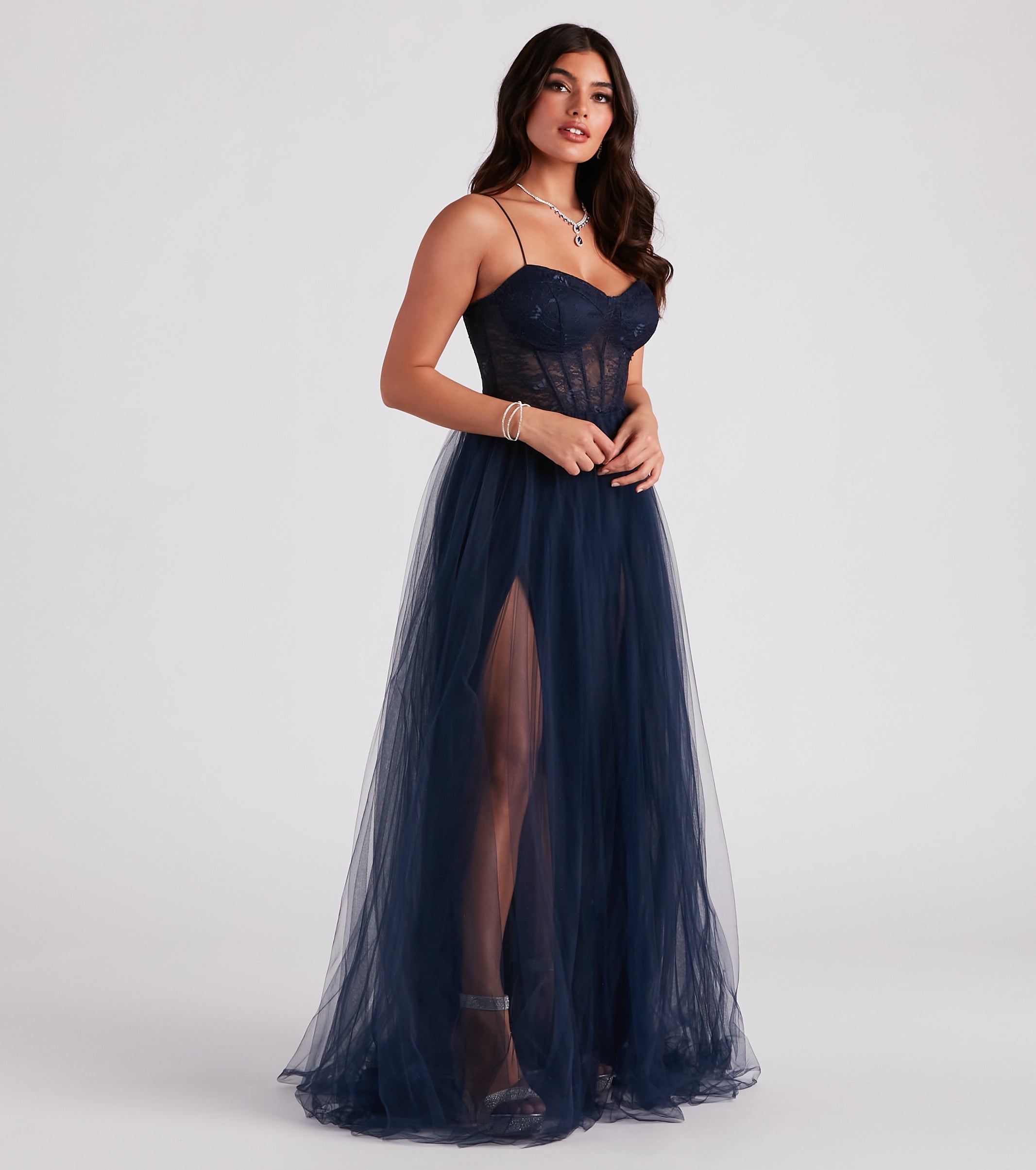 Radiate in a stunning dress that is fit for a queen! Hailey enchants with a sleeveless sweetheart neckline to showcase your rhinestone necklace, molded padded cups that eliminate the need for a bra, and sleek bungee straps. Her bodice features a gorgeous lace design, contrast piping, and flexible boning that offers support. Her slim-fit bodice leads to a flowy floor-length A-line skirt composed of tulle. Her knit lining features a daringly high side slit to create a chic sheer contrast. Complete your formal outfit for a gala or ball with rhinestone heels and a clutch.Â