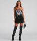 You're with the band. Enter backstage in this edgy babe-status graphic short dress featuring a strapless bodice, lace-up bungee straps, flexible boning inserts, side denim panels with seam detail, and a front script that reads, 'Make Some Noise/ Hardrock' and a form-fitting short hem. Complete the look in a ring set.