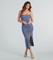 This glitter knit midi dress will showcase an iconic glimmer and shimmer all night long. Designed with a gorgeously glitzy glitter knit fabric, this mid-length dress features a sleeveless square neckline, bungee spaghetti straps, a bold open back with bungee bar straps, ruched detailing down the front and back, a thigh-high front slit, and a slim-fit silhouette. The glitter knit fabric offers plenty of stretch. Complete your dressy look with silver metallic heels!