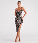 You'll be ready for your paradise getaway with this tropical print midi dress! It features a sleeveless V-neck, spaghetti straps, a sultry cutout back, a bodycon silhouette, and an asymmetrical side slit cutout. Complete the look in wedges.