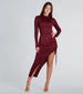 This alluring mock neck high slit midi dress needs to be in your winter lineup! It features a mock neckline, long fitted sleeves, a trendy ruched side seam with an adjustable drawstring, an asymmetric midi-length hem creating a high-cut side slit, and a form-hugging silhouette to flaunt your figure. The brushed knit fabric offers plenty of stretch. Style this midi dress with ankle booties!