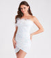 Captivate the crowd in the Izzey sequin party dress perfect for brides or birthday girls! She shines in a strapless neckline adorned with feather trim and non-slip grip lining, a bodycon silhouette, and a faux wrap mini-length hem. The party dress is composed of a sequin-knit velvet fabric with a stretchy knit lining. Complete the look in luxe earrings and heels for an unforgettable style!