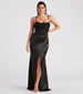 Inspire awe as you walk into the room in the Janie formal long dress at banquets, school dances, and black tie events! She stuns in a sleeveless cowl neck, adjustable spaghetti straps so you can customize the fit, cross-back strap design, built-in padded bust, and flexible boning inserts along her lace mesh bodice. The side pleated seam leads to the form-hugging, mermaid wrap silhouette with a sultry front slit. The formal dress is composed of a lace and satin-lined fabric with a moderate stretch. Complete the look with an embellished clutch purse.