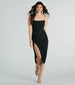 Look exquisite in this luxurious Jesenia formal midi dress, featuring a glamorous sleeveless cowl neckline, adjustable spaghetti straps, bodycon silhouette, and an eye-catching front knotted accent with a slit and midi-length hem. You'll shine with the dazzling rhinestone-embellished mesh fabric and offers a stretchy knit lining. Complete the look in a glam necklace and heels for a banquet or holiday dinner!