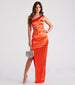 With a silky satin sheen and a sophisticated one-shoulder neckline, the Jess formal dress combines chic with goddess vibes! Step out and stun at spring parties, weddings, and dinner banquets. She features a sleeveless bodice with a tank-style strap, a sheer mesh striped insert, and a form-hugging slim silhouette with a sexy high-side slit and long hem. The formal dress is composed of lined satin fabric with a moderate stretch. Style with a choker necklace and heels to complete the look!