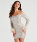 Prepare to glisten like never before in the mesmerizing Jolie sequin mini dress for a night you'll never forget! She embodies '90s fashion couture in her off-the-shoulder neckline with long sleeves and feathered cuffs for a diva-liscious look. Her high waist seam leads to the bodycon silhouette and short-length hem. The formal dress is composed of a sequin fabric with a knit lining and minimal stretch. Complete your dressy outfit with a clutch and stiletto heels.