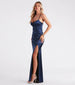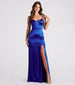 So glam and luxurious! Go all out in this Jules formal long dress for a stunning walk down the red carpet. She features a sleeveless V-neck with a wire insert, adjustable spaghetti straps, a pleated bust with padding, and a high waist seam. Her flattering a-line silhouette is designed with a skin-flaunting high-cut front slit. The formal dress is composed of a lined silky satin fabric with a subtle sheen and moderate stretch. Style with a rhinestone clutch and bracelet.