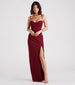 Chic, sultry, and showstopping, the Justine formal crepe dress is a stunning style for dinner banquets, ceremonies, and anniversary parties! She features a sleeveless sweetheart neckline with a lovely cowl draping, spaghetti straps, a padded bust, a hip-hugging slim silhouette, and a sexy high front slit along her floor-length hem. The formal dress is composed of a lined crepe fabric with minimal stretch. Complete the look with an embellished box clutch and heels.