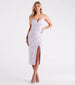 You'll be absolutely dazzling in the Kadence formal sequin midi dress at your next dressy event! She features a lovely sleeveless sweetheart neckline with a wired insert, a lightly padded bust, adjustable spaghetti straps, a lace-up open back with tie closure, and a body silhouette showcasing a front slit to flaunt some leg along the midi-length hem. The formal midi dress is composed of an iridescent sequin-scroll embellished mesh fabric with a stretchy knit lining. Complete the look in strappy rhinestone heels for extra glitz!
