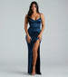 Capture the attention in the Kadia formal satin dress and steal the scene at the school dance or black tie soiree! She features a sleeveless V-neckline, adjustable spaghetti straps, an eye-catching lace-up back design, and a flattering mermaid silhouette that leads her floor-length hem with a high front slit. The formal dress is designed with sparkly rhinestone embellishments on the silky satin fabric to give you a luxe feel! Complete the look with a rhinestone clutch.