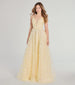 Evoke an ethereal and whimsical presence in the stunning Kallie ball gown in which you'll feel so beautiful as a bride, prom queen, or at a formal black-tie affair! She features a sleeveless plunge sweetheart neck with a sheer mesh insert, adjustable spaghetti straps that lace up along the back, a padded bust, and a flattering A-line silhouette that leads to the floor-length bonded hem. The ball gown is designed with a butterfly mesh fabric with sparkling sequin embroidery and a smooth satin and tulle lining.